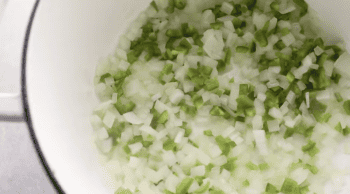 Sauté the Veggies: Crush enough tortilla chips to brand 3 tablespoons together with gear up aside. Heat a Dutch oven over medium heat, together with add two tablespoons of vegetable oil. Add 1 diced yellowish onion and prepare for iii minutes or until softened together with translucent. Add 2 diced jalapeños and cook for an additional ane infinitesimal, and then add together iv cloves of minced garlic together with fix for thirty seconds.
