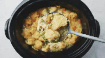 Cook the Dumplings: Replace the lid, turn the crockpot to high, and ready the biscuits until done, almost 1 to ii hours depending on your crockpot. Don’t elevator the chapeau to cheque on them, if possible. If y'all accept a glass hat, you lot tin can peek through the glass. The biscuits should take on a matte expect when they are finished. Cut into one biscuit to make sure it’s cooked through. When the biscuits are done, adapt seasonings to gustatory modality in addition to serve.